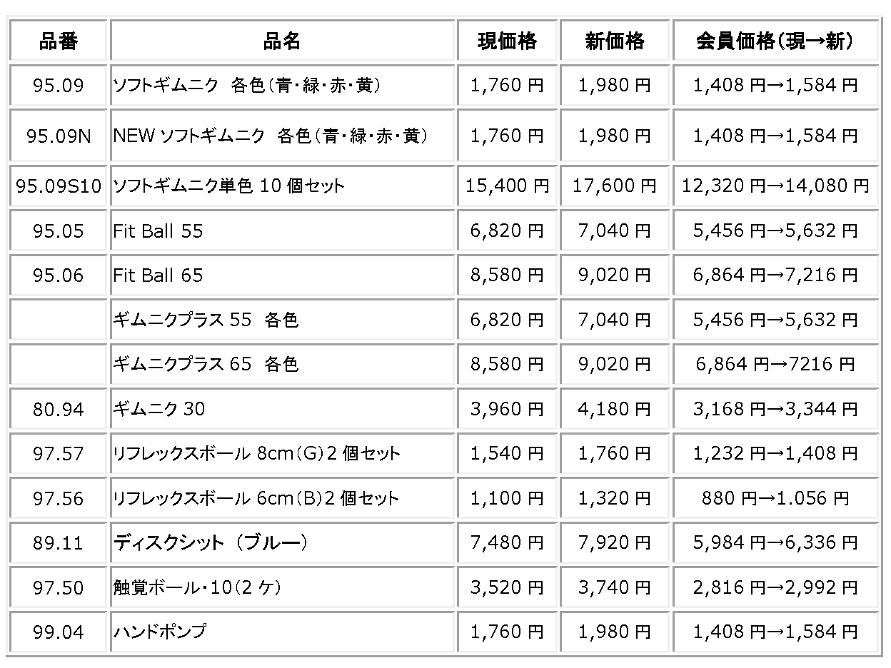 価格改定商品:ソフトギムニク、ギムニクボール、ギムニクプラス、触覚ボール、ディスコシットなど